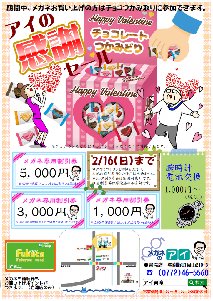 皆さんこんにちは(^^)岩滝店の上田です。毎日寒い日が続いていますが、元気にお過ごしでしょうか?? 只今、岩滝店では、感謝セールを開催中です!メガネをお買い上げいただいたお客様に、チョコのつかみどりに挑戦していただいています(^3^)たくさん... -