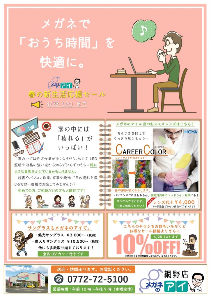京丹後市網野町にありますメガネのアイ網野店です。 4月は、”おうち時間”をより快適に過ごせるアイテムをご提案したいと思いますっ(* ˃ ᵕ ˂ )b ☆*。。。*☆*。。。*☆*。。。*☆*。。。*☆*。。。*☆見ることを楽しむキャリアカラー☆*。。。*☆*。。。*☆*... -
