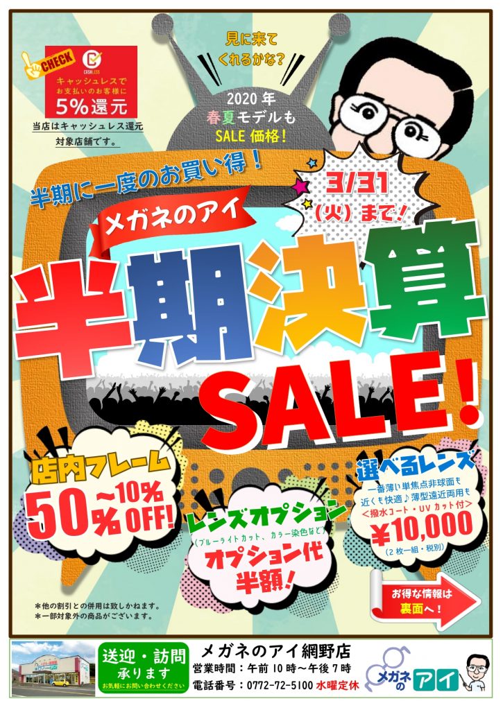 京丹後市網野町にありますメガネのアイ網野店です。 ブログを見ていただいた方だけに、3月5日より開催します、『半期決算SALE』先行案内いたします(≧▽≦) 今回のSALEの目玉は、 ☆*。。。*☆*。。。*☆*。。。*☆*。。。*☆*。。。*☆店内フレ...