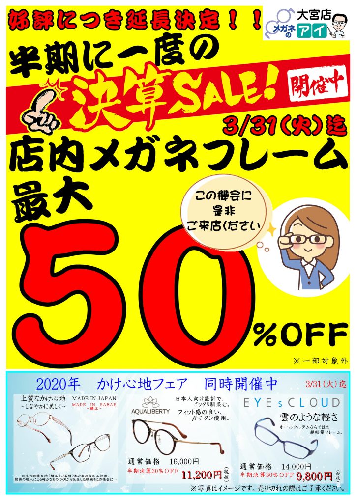 いつもお世話になっております。メガネ・補聴器のアイ大宮店 スタッフの文珠です。3月1日から開催しています決算セールですが、人気好評中につき延長決定いたします!17日まで→31日まで!メガネを買おうか悩んでおられる方、是非一度下見にお越しく... -