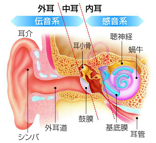 【聞こえの仕組みについて】図のように、人間の耳は外耳、中耳、内耳の3つの部分から成り立っています。耳介から入った音は、外耳道を通り、鼓膜からツチ骨・キヌタ骨・アブミ骨によって内耳に伝えられます。蝸牛によって音の高低や強弱を識別し、有毛細胞... -
