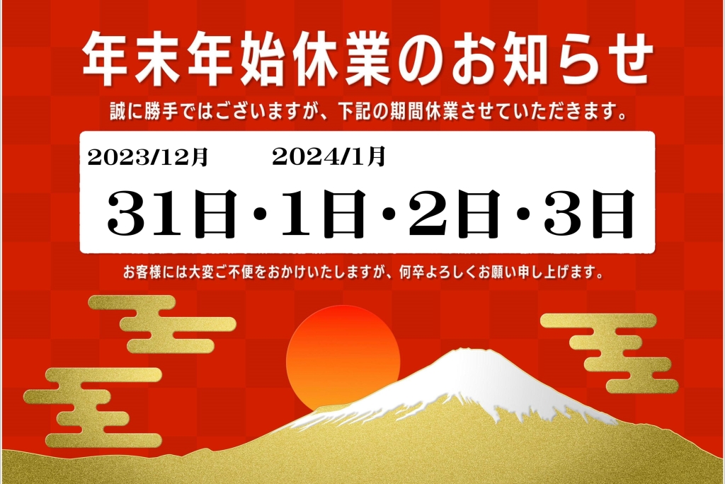 年末年始の休業日 お知らせ 2023 12/29 アイについて 2023.12.29 2023.12.29 関連記事 お知らせ 【お知らせ】GW期間の営業について 【お知らせ】年末年始の営業時間のご案内。 アイについて URL Copied! URL Copied! 年末年始のお知らせ 年末年始 休業のお知らせ & 初売り