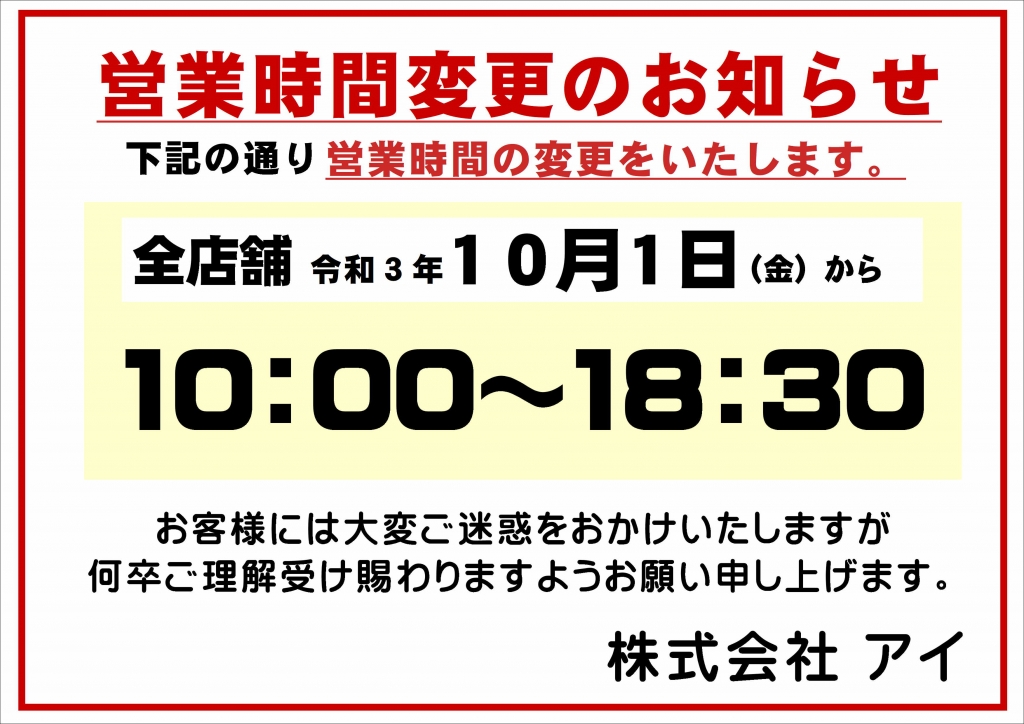 営業時間 変更のお知らせ 重要 2021 9/16 アイについて 2021.09.16 2021.09.16 重要なお知らせ 全店舗 令和3年10月1日(金)から営業時間の変更いたします。 開店時間 朝10時 閉店時間 夜6時30分 お客様には大変ご迷惑をおかけいたしますが 何卒ご理解受け賜わりますように お願いもうしあげます。 加悦本店 11月セール👓✨ 2025.11.13 出石店 メガネのアイ出石店 「見えかた体験会」 2025.11.07 岩滝店 11月 クーポンSALE 2025.11.03 関連記事 営業時間:休業日のお知らせ new balance -ニューバランス-【フレーム】 アイについて URL Copied! URL Copied! 営業時間変更のお知らせ 営業時間変更のお知らせ