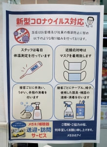 株式会社アイでは医療機器の消毒に使用される次亜塩素酸水を用いてメガネや補聴器、それらに関連する商品、接客ごとにテーブルや椅子の消毒を行っております。また店内での接客応対、送迎・訪問時にもスタッフはマスクを着用し、感染予防に努めております。