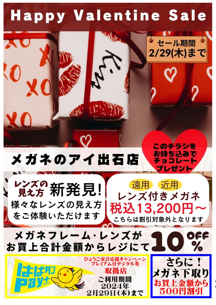 こんにちは(・o・)メガネ・補聴器のアイ岩滝店です。今月は♡♡♡バレンタインセールを開催しています(´艸`*)毎年恒例の ♡メガネご購入で、チョコレートのつかみ取り♡ 今年も本気でつかんでください♡♡♡また、クーポン券を使って、メガネをお得にゲットして... -