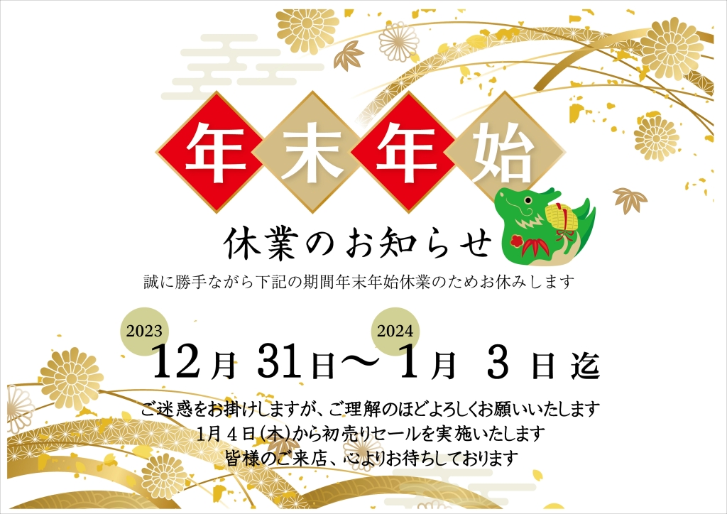 旧年中は格別のご厚情を賜り厚くお礼申し上げます。皆様にはこれまで以上にご満足いただけるようスタッフ一同気持ちを新たにしております。本年もどうぞよろしくお願いいたします。日頃のご愛顧への感謝を込めて1/4(木)午前11:00より新春セール開催\(^o... -