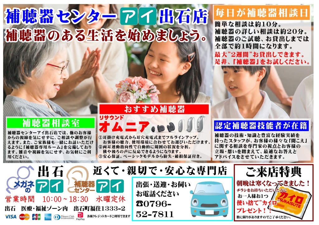 いつもお世話になっております。「補聴器センターアイ出石店」は毎日が補聴器相談日です。簡単な説明は約10分。補聴器のご視聴からお貸出しまでは全部で約1時間。尚、お貸出しは最大2週間。是非この機会に補聴器をお試しください。 -