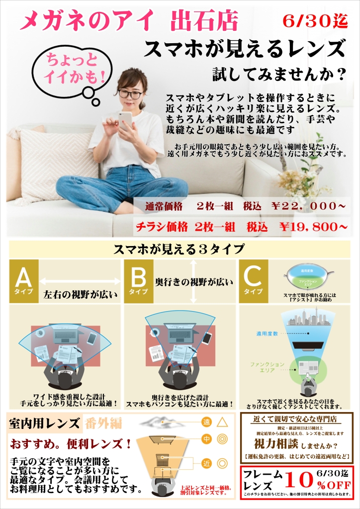 ”スマホ”が見やすいレンズを試しませんか?こんにちは、いつもお世話になっております。メガネのアイ 補聴器センターアイ 出石店 です。皆様はスマホを見る時、「少し見えにくいなぁ?」と感じたり、少し腕を伸ばしてスマホを「遠くにしたくなること」はありませんか?どうしても40歳以上になる...