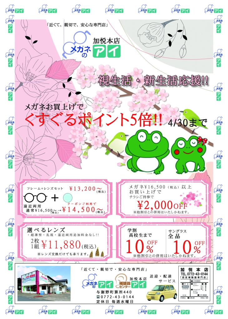 くすぐるポイント5倍セール( *´艸`)与謝野町加悦のメガネのアイ/補聴器センターアイ加悦本店です(*^-^*)4月セールのご案内です。開催期間は4/30(日)迄チラシ持参特典🎁学生さんは学割フレーム/レンズが10%OFF既製サングラス🕶も10%OFFレンズ付き16,500円セットもチラシ持...