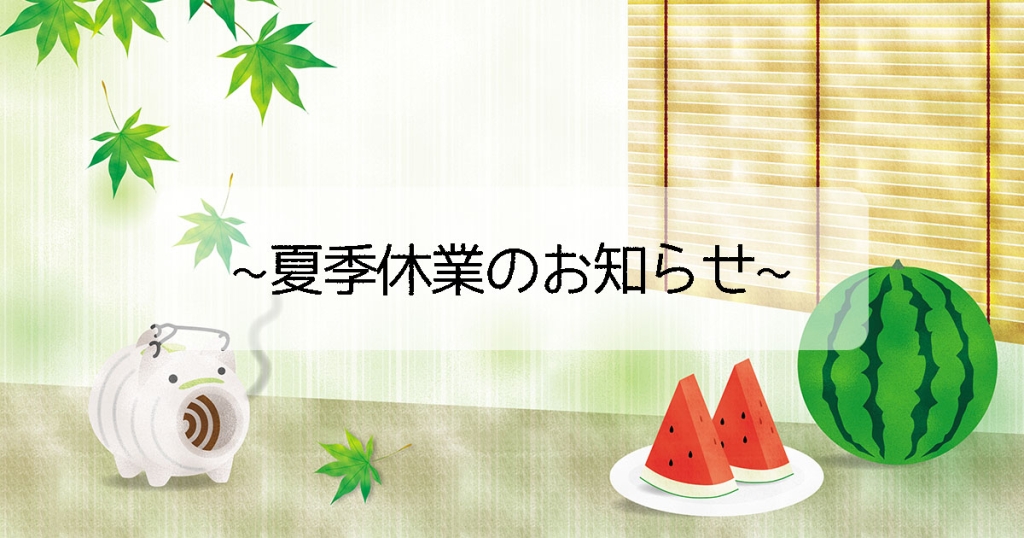 夏季休業のお知らせ夏季休業のお知らせ8月10日(水)~8月12日(金)誠に勝手ながら、上記期間は全店休業とさせていただきます。お客さまにはご不便をおかけいたしますが、何卒ご理解のほど、よろしくお願い申し上げます。*****