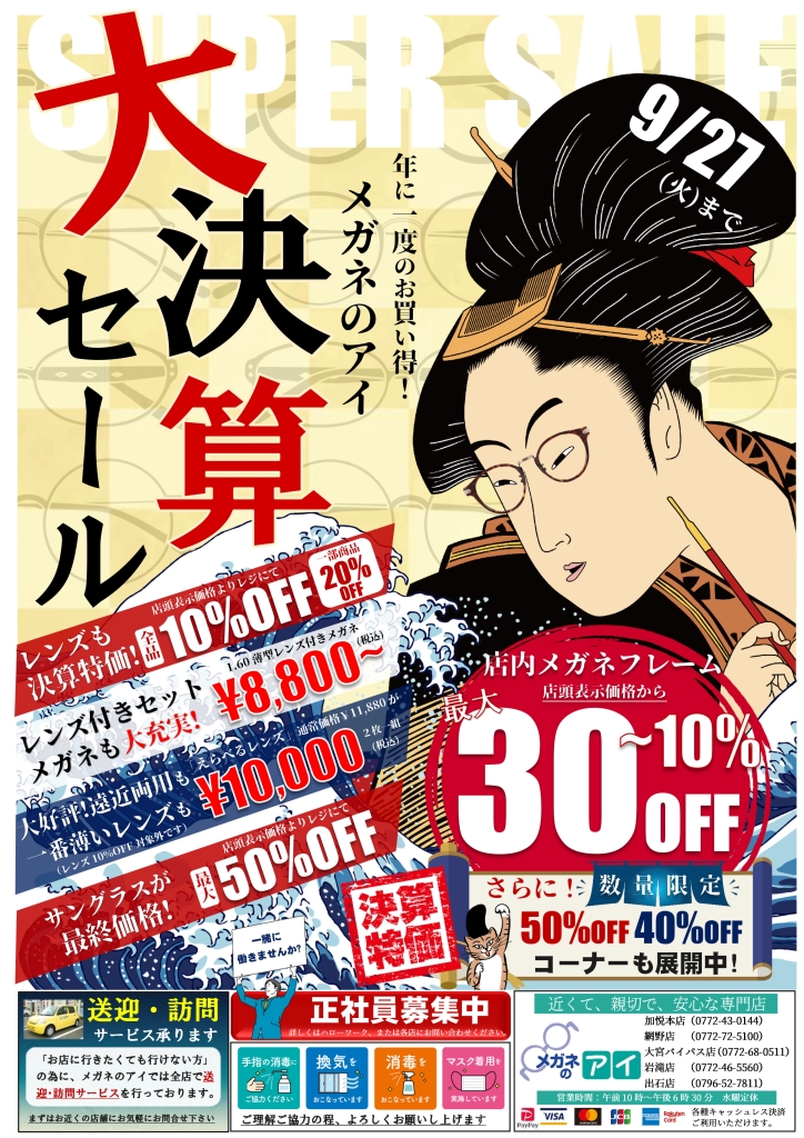出石店 決算セール(*^^*)豊岡市出石町福住のメガネのアイ/補聴器センターアイです。8/13(土)午前10:00より大決算セールを開催いたします(*´▽`*)メガネフレーム👓売切り特価の商品や福井県鯖江産のフレーム 最大50%~10%OFF大手メーカーレンズ高機能遠近レンズ、室内...