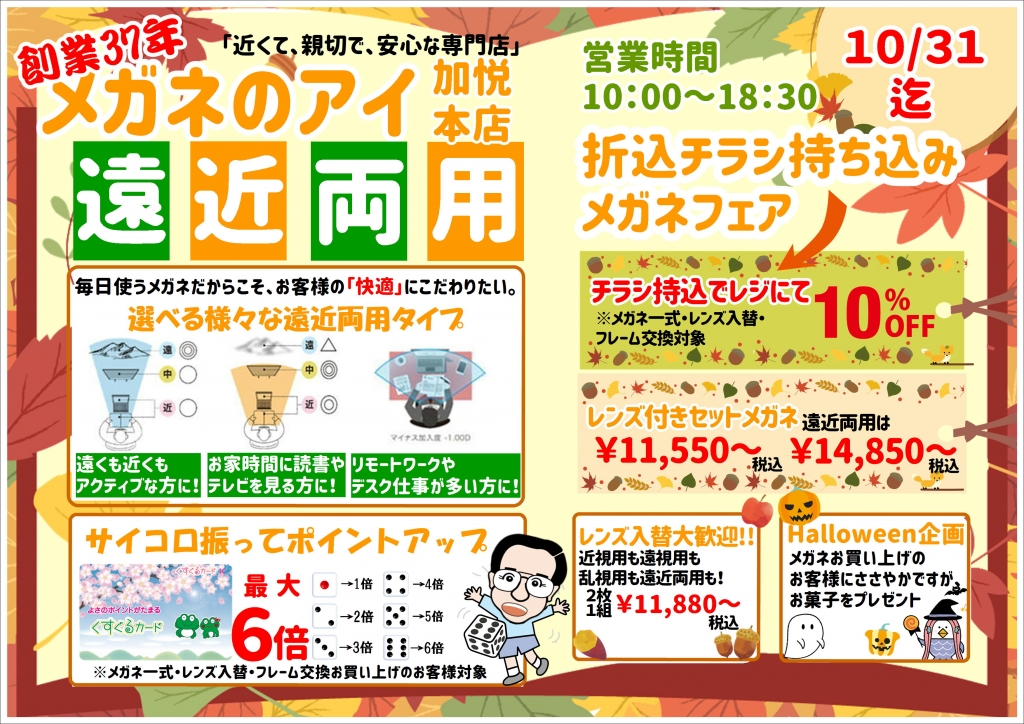 豊岡市出石町福住のメガネのアイ/補聴器センターアイです(*^^*)店内 ハロウィン🎃演出にしました(*^▽^*)10月はメガネクリーニングサービスご利用のお客様にささやかではありますが来店プレゼントをご用意いたしました(^O^)お子様、お孫様とご一緒...
