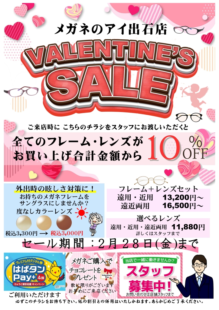 いつもお世話になっております。「メガネのアイ」「補聴器センターアイ」出石店です。2月のセール案内になります。メガネ購入者様にチョコレートをプレゼント中です。数に限りがありますのでなるべくお早めにご来店、ご購入をお願いいたします。ご来店お... -
