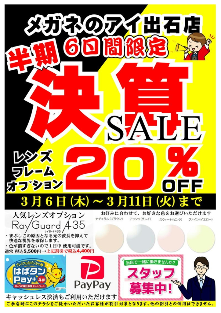 こんにちは(*^^*)メガネ・補聴器のアイ岩滝店です。本日より!半期決算セールを開催いたします!なんと!このセール!メガネ一式お買い上げで、店内のメガネフレームがほぼほぼ全品20%オフになります( *´艸`)また、チラシご持参、またはブログ・インスタ... -