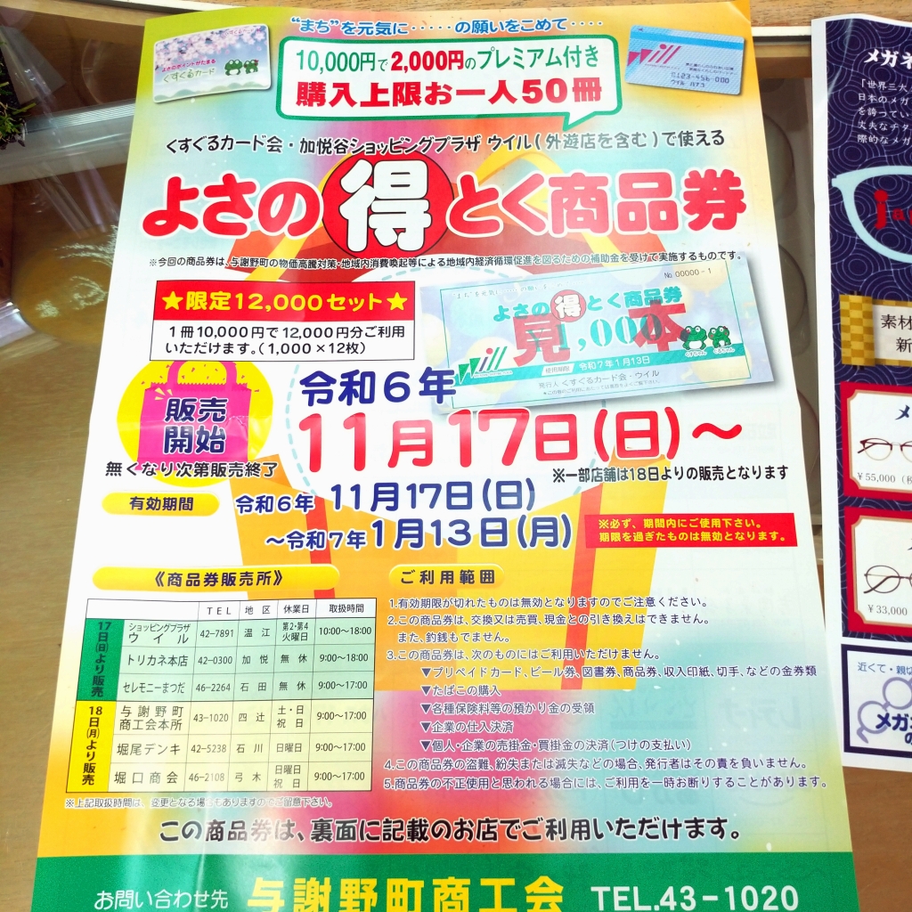 メガネのアイ/補聴器センターアイ加悦本店です。11/17(日)からプレミアム付き商品券が販売されます。限定12,000セット購入上限お一人様50冊10,000円購入でで12,000円分ご利用いただけます(*^-^*)商品券販売所↓メガネのアイ/補聴器センターアイ加悦本店は... -