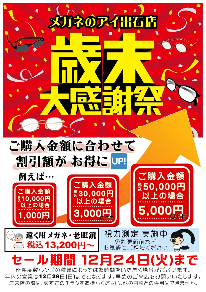 いつもお世話になっております。「メガネのアイ出石店」「補聴器センターアイ出石店」です。一年も早いもので、もう年末ですね。朝晩の寒さも一段と厳しくなってきました。そんな中ではありますが、歳末大感謝祭を開催中!!是非この機会にご来店ください... -