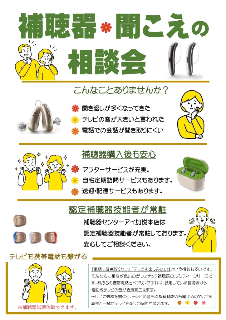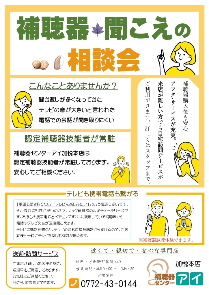 メガネのアイ/補聴器センターアイ加悦本店です(*^▽^*)10月の聴こえの相談会のご案内です👂ご来店が難しい方には送迎・出張サービスもございます。□テレビの音が大きいと言われた□電話での会話が難しい□聞き返しが多くなってきた少しでも聞こえでお... -