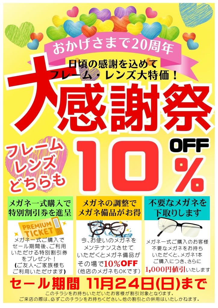 いつもお世話になっております。「メガネのアイ」「補聴器センターアイ」出石店です。但馬地域の出石町に店を構えてから、20周年を迎えることができました。これもひとえに地域の皆様にご愛顧いただいたおかげでございます。この先も5年、10年とご愛顧いた... -
