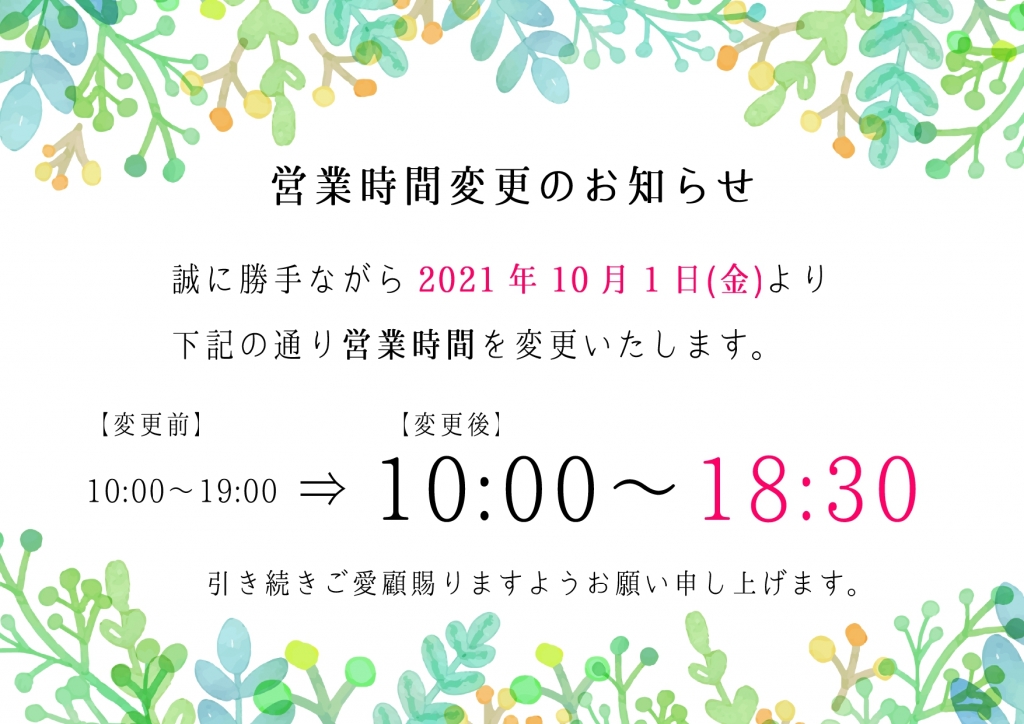 いつもメガネのアイ網野店をご利用いただき誠にありがとうございます。 誠に勝手ながら 2021年10月1日(金)より、下記の通り営業時間を変更いたします。 【変更前】 10:00-19:00【変更後】 10:00-18:30 引き続きご愛顧賜りますようお願い申し上げ... -