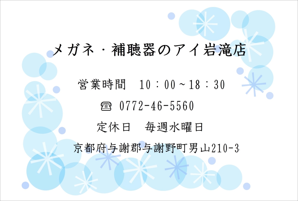 こんにちは、メガネ・補聴器のアイ岩滝店です(*^^*)
