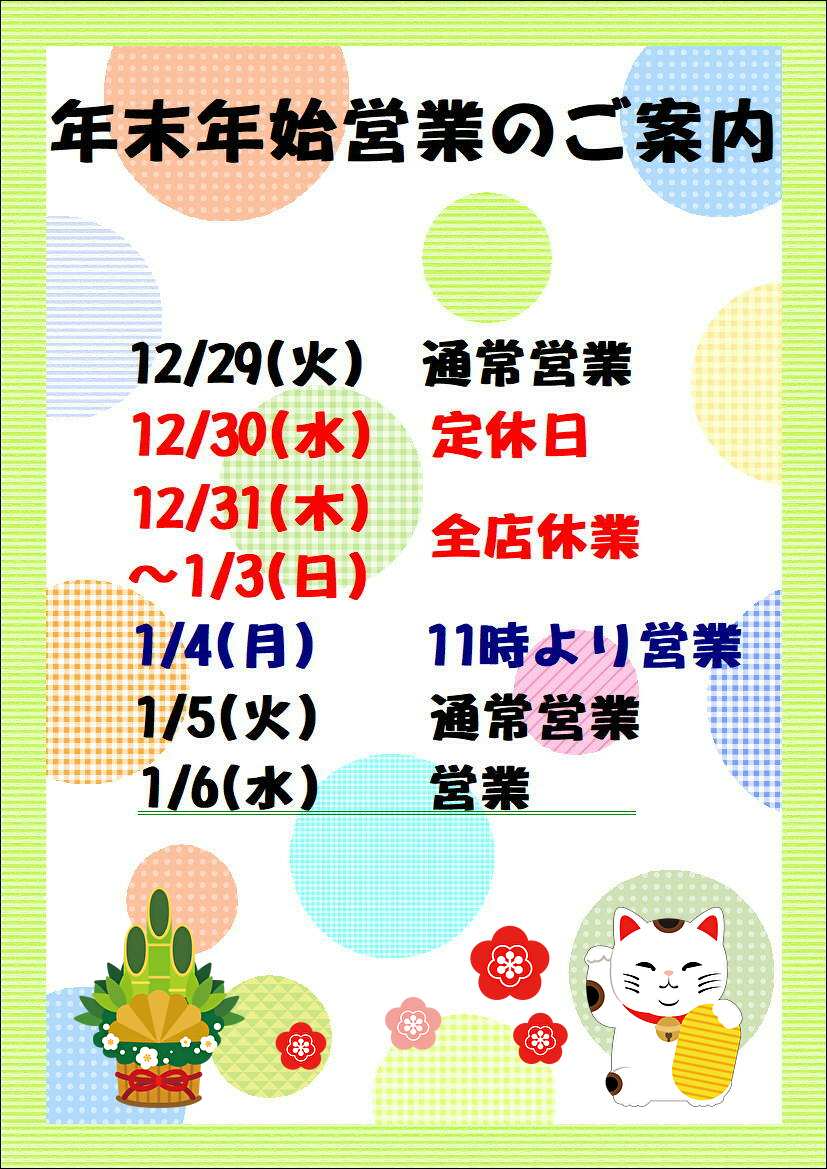 年末年始の営業は、下記のようになっております。