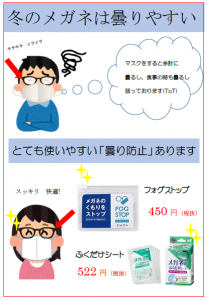 曇り止めはメガネ備品コーナーに陳列してあります。