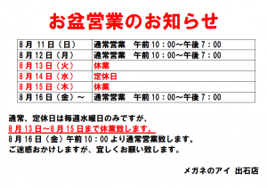 さて、今回はお盆営業案内です。