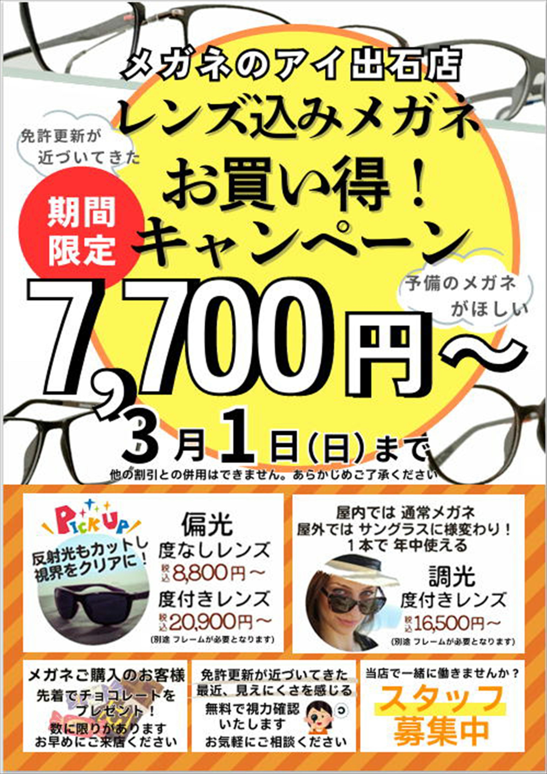 出石店では【期間限定】レンズ込みメガネお買い得!キャンペーンを開催中です。