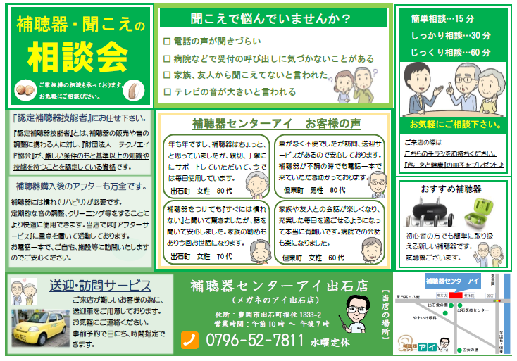 補聴器センターアイは『認定補聴器技能者』が常駐しおります。わかりやすく・親切・丁寧にを心がけております。安心してご来店ください。