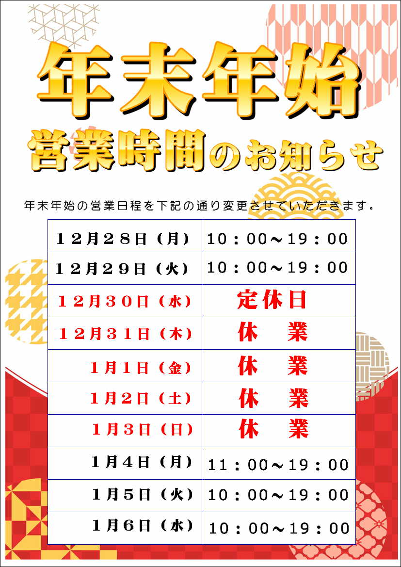 年末年始のお知らせ 2021 5/23 加悦本店 2020.12.27 2021.05.23 メガネのアイ 加悦本店 店長田中です。 与謝野町の皆さま今年も残すところあとわずか 歳末セールは12月29日までとなります! 初売りは1月4日11時~ 与謝野町算所440 ℡0772-43-0144 加悦本店 🎃ハロウィンセール🎃 2025.10.20 加悦本店 10月 補聴器・聞こえの相談会👂 2025.10.10 加悦本店 西日・眩しさ対策おすすめレンズ 2025.10.05 関連記事 コンタクトレンズお取り寄せできます。 初売り 恒例おみくじ おうちメガネ半額キャンペーン!! 年末年始の営業のお知らせ 重要 営業時間変更のお知らせ 加悦本店 くすぐるくすぐるカードメガネ与謝野町年末年始お知らせ補聴器 URL Copied! URL Copied! *年末年始営業のご案内* 年末年始のお知らせ(*'ω'*)