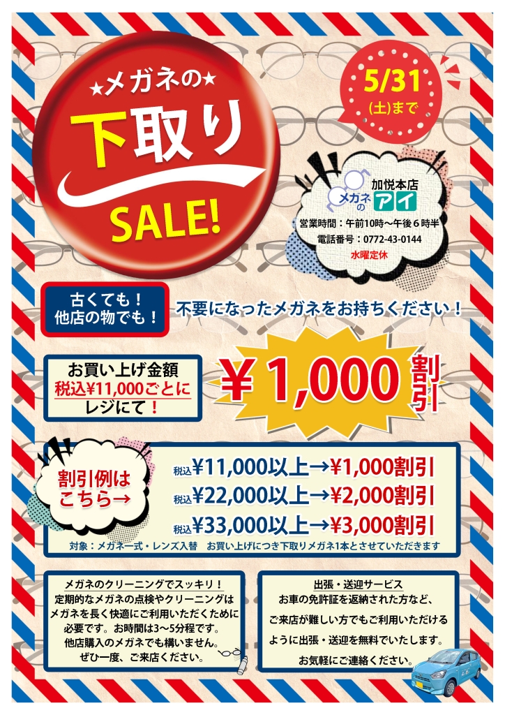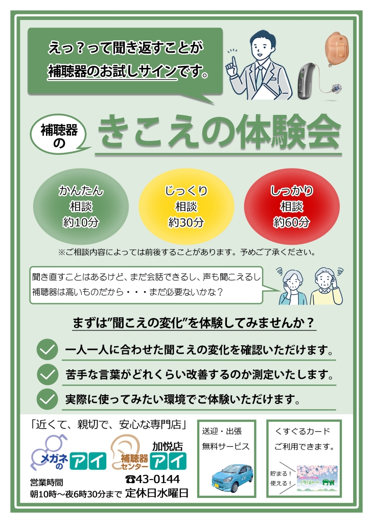 メガネ下取りセール(*‘ω‘ *) 2025 5/16 加悦本店 2025.05.16 2025.05.16 メガネのアイ/補聴器センターアイ加悦本店です。 ただいまメガネ下取りセール開催中です(^o^) 「補聴器・聞こえの相談会」も開催しております。 お気軽にご相談ください<(_ _)> 加悦本店 11月セール👓✨ 2025.11.13 加悦本店 🎃ハロウィンセール🎃 2025.10.20 加悦本店 10月 補聴器・聞こえの相談会👂 2025.10.10 メガネのアイ/補聴器センターアイ 加悦本店 営業時間 10:00~18:30 電話番号 0772-43-0144 定休日 毎週水曜日 与謝野町算所440 送迎・配達サービス 関連記事 メガネのアイ 加悦本店 メガネ下取りセール!! 視生活応援セール(=^・^=) 2月セール🍫 半期決算セール( *´艸`) 2月 補聴器・聞こえの相談会👂 加悦本店 メガネ与謝野町京丹後市宮津市補聴器 URL Copied! URL Copied! 始めませんか?紫外線対策! PINKY&DIANNE|ピンキー&ダイアン 【フレーム】