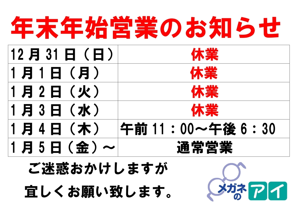 🐰年末年始の営業案内🐉 2023 12/29 加悦本店 2023.12.28 2023.12.29 年末年始のご案内です。 ご迷惑おかけしますがよろしくお願い致します<(_ _)> 加悦本店 期間限定🎲 2025.11.17 加悦本店 11月セール👓✨ 2025.11.13 加悦本店 🎃ハロウィンセール🎃 2025.10.20 メガネのアイ/補聴器センターアイ 加悦本店 営業時間 10:00~18:30 電話番号 0772-43-0144 定休日 毎週水曜日 与謝野町算所440 送迎・配達サービス 関連記事 夏季休業のお知らせ🎇 12月 補聴器相談会 臨時休業のお知らせ 10月補聴器・聞こえの相談会👂 11月クーポン割引セール( *´艸`) 加悦本店 メガネ与謝野町京丹後市宮津市補聴器 URL Copied! URL Copied! メガネのネジのゆるみストップ 年末年始のお知らせ