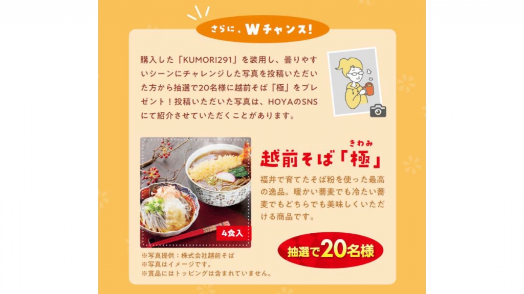 「くもり291」で作ったメガネを使って曇りやすいシーンにチャレンジした写真を投稿していただくと抽選で越前そば 当たります!