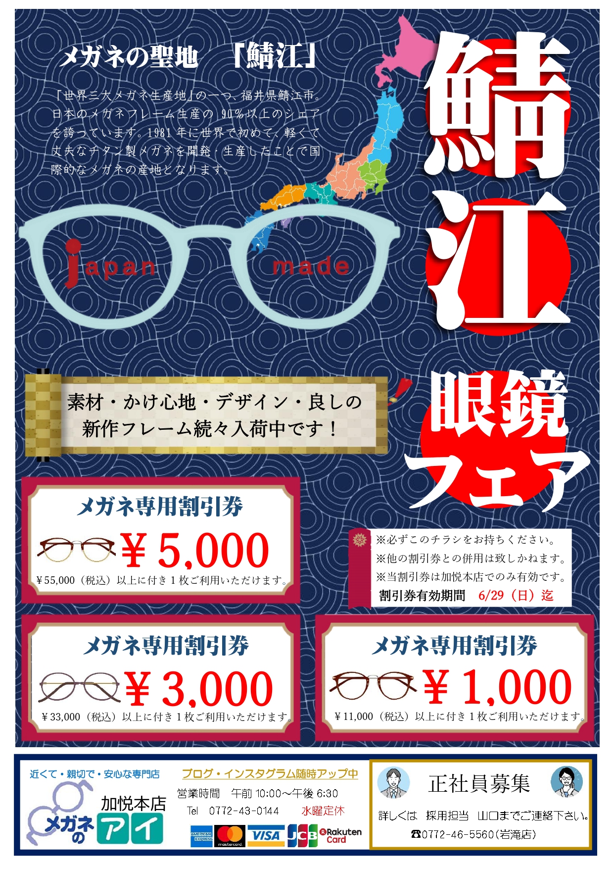 只今、メガネのアイ加悦本店では、フレームを最大50%OFF/半額中!!