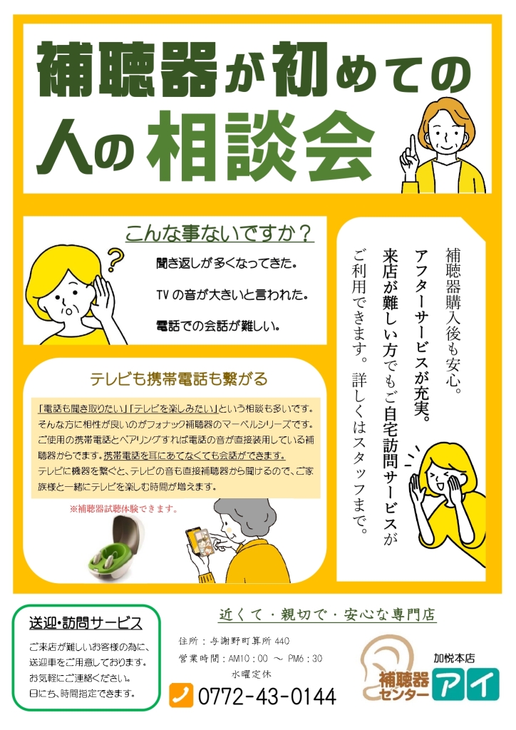 12月 補聴器相談会 2023 12/08 加悦本店 2023.12.08 2023.12.08 今年最後の補聴器相談会のご案内です。 年内は12/30(土)まで営業しております。 ご来店が難しい方には送迎・出張サービスご利用いただけます(*^▽^*) お気軽にご相談ください<(_ _)> 加悦本店 11月セール👓✨ 2025.11.13 加悦本店 🎃ハロウィンセール🎃 2025.10.20 加悦本店 10月 補聴器・聞こえの相談会👂 2025.10.10 メガネのアイ/補聴器センターアイ 加悦本店 営業時間 10:00~18:30 電話番号 0772-43-0144 定休日 毎週水曜日 与謝野町算所440 送迎・配達サービス 関連記事 夏季休業のお知らせ🎇 臨時休業のお知らせ 10月補聴器・聞こえの相談会👂 11月クーポン割引セール( *´艸`) 11月 補聴器・聞こえの相談会👂 加悦本店 メガネ与謝野町京丹後市宮津市補聴器 URL Copied! URL Copied! メガネの冬支度はじめませんか? PINKY&DIANNE|ピンキー&ダイアン 【フレーム】