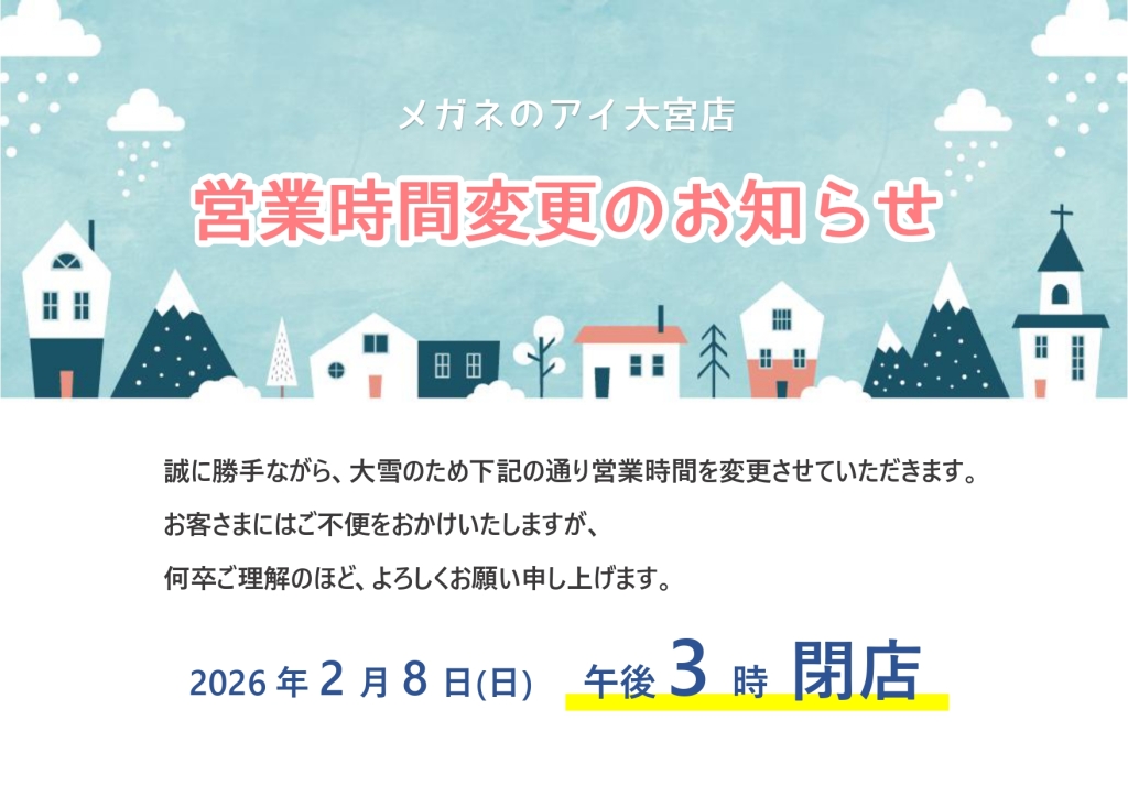 誠に勝手ながら、大雪のため下記の通り営業時間を変更させていただきます。