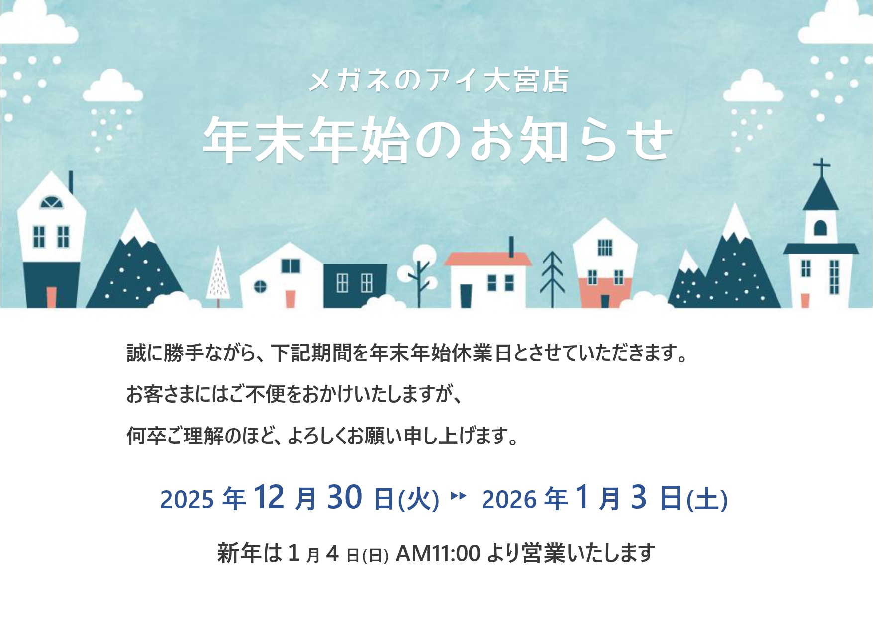 年末年始の休業期間は下記の通りです。