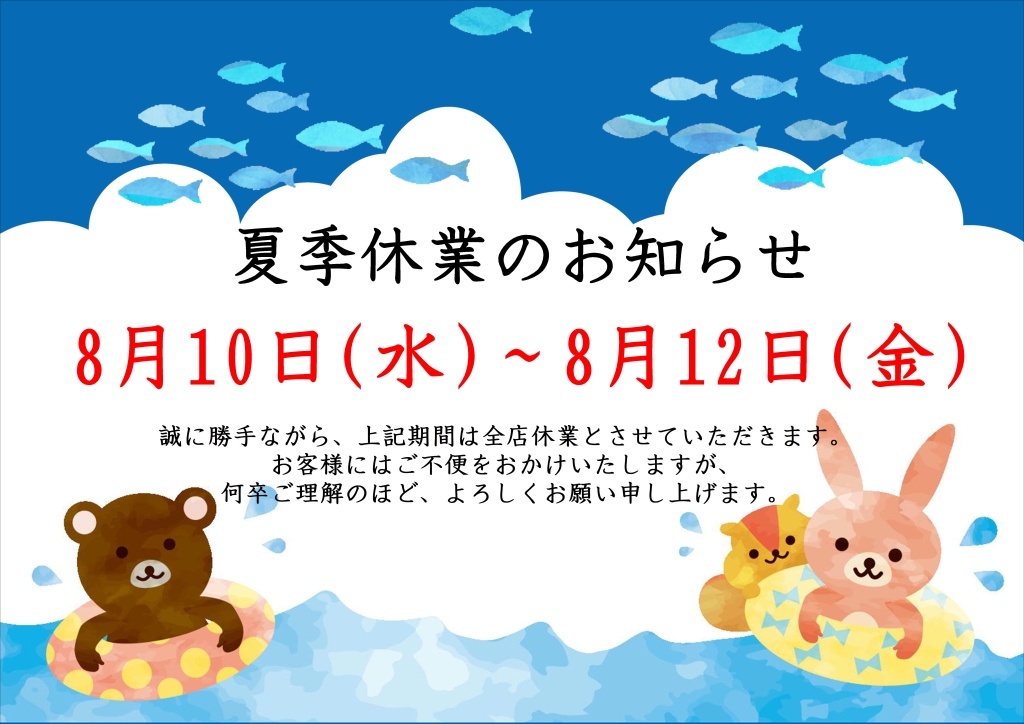 夏季休業のお知らせ8月10日(水)~8月12日(金)誠に勝手ながら、上記期間は全店休業とさせていただきます。お客さまにはご不便をおかけいたしますが、何卒ご理解のほど、よろしくお願い申し上げます。***** -