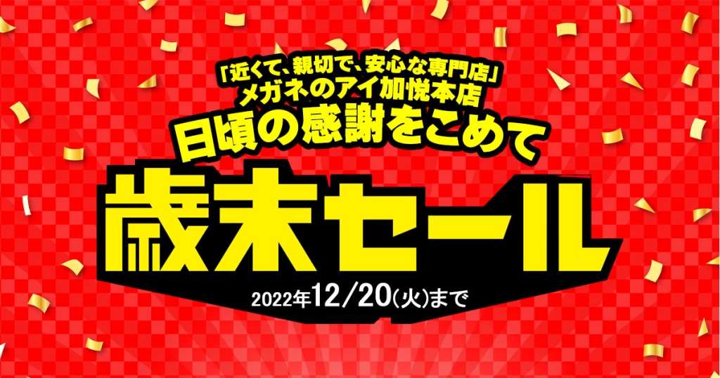 与謝野町の皆様こんにちは!メガネのアイ/補聴器センターアイ加悦本店です。早いもので今年ももうすぐ終わります。2022年もありがとうございました!!本年最後のセールのご案内です。~6日限りの大特価!!大感謝祭~セール期間は12/24.25.26.27.29.30の6日間... -