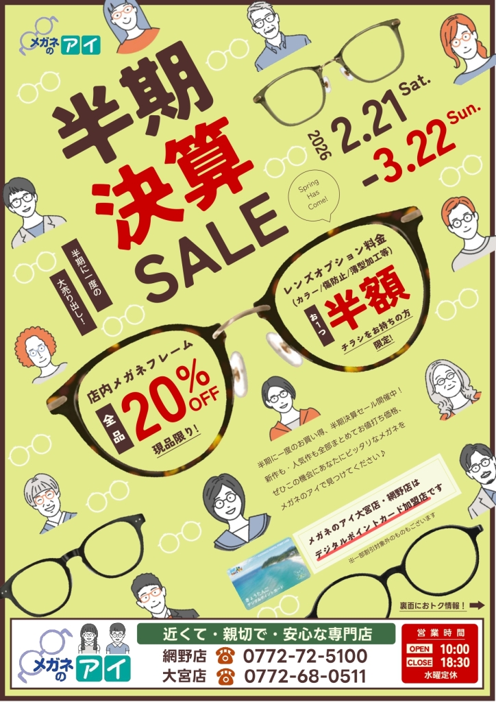 ・ こんにちは、メガネのアイ大宮店です! いつもお世話になっております。 ・ ・今月のお得なイベントのお知らせです~ ✿✿ ・・ 🌟 🌟 🌟 🌟 🌟 🌟 🌟 🐈 【 半期決算SALE 】 ・ \\... -